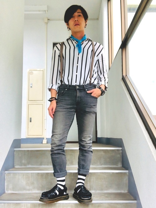 グレージーンズにストライプのシャツをインして、サスペンダーをアクセントにした大人かわいいコーデです。少し子供っぽさも感じますが、遊び心ある着こなしがおしゃれに決まっています。