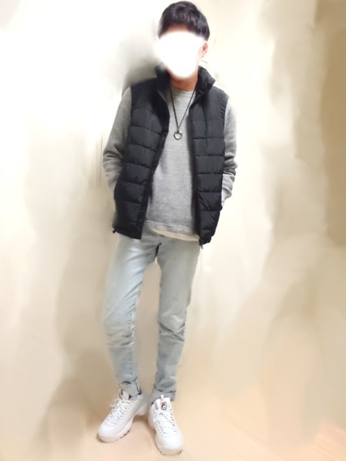 肌寒さ残る春先にぴったりのロンTとダウンベストの重ね着コーデです。グレー、ブラック、ホワイトのモノトーンで揃えた全身コーデは、休日のかっこいい大人スタイルにぴったりでしょう。
