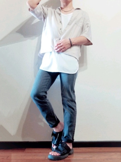 グレージーンズとサンダルを合わせた爽やかコーデです。短い丈のシャツを選んで、わざと長さのあるタンクトップでチラ見せさせた着こなしもバランスが取れています。