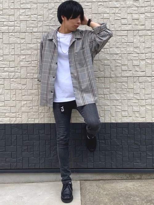 グレージーンズとチェック柄シャツを組み合わせた大人コーデです。シャツはボタンを開けて中の白Tシャツを見せることで、清潔感ある着こなしとなっています。ベルトのブランドロゴをチラ見せさせているところもおしゃれポイントです。