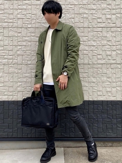 グレージーンズとカーキのコートを組み合わせたミリタリーコーデです。ロングコートを選ぶなら、パンツはスキニーですっきり見せるのがよいでしょう。ミリタリーは時代や年齢問わず、メンズに人気なスタイルなのでまだ挑戦したことがない方はおすすめです。
