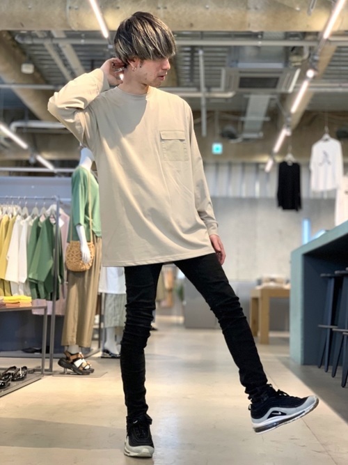 グレージーンズと長袖Tシャツ、スニーカーのラフなカジュアルコーデです。ぴったりしたシルエットのパンツとは逆に、長袖Tシャツは少しゆとりをもたせたサイズを選ぶことで、バランスの取れた着こなしとなっています。