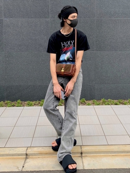 パンツのセンターラインにジッパーが付いた、おしゃれなグレージーンズとシンプルなTシャツのパンク系コーデです。デニムのデザインが目を引くので、画像のようにトップスはあえてシンプルのほうがコーデが派手になりすぎないでしょう。