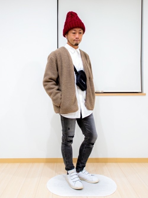 グレージーンズと冬コーデらしくフリースのアウター、ニット帽を使った暖かコーデです。冬の定番カラーであるベージュとボルドーを使っているところもポイントとなります。