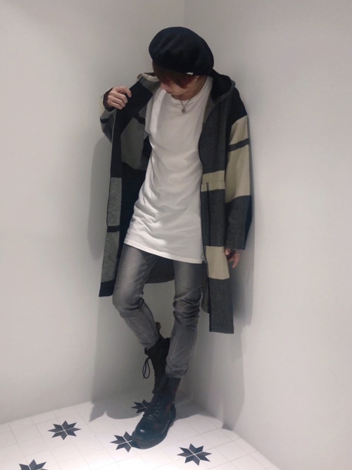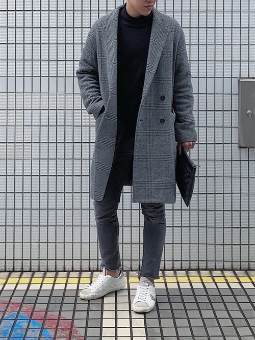 細身のシルエットのグレージーンズにBIGシルエットのコートを合わせたカジュアルコーデです。華奢なメンズは、BIGシルエットのコートを着るとバランスの取れた着こなしとなります。