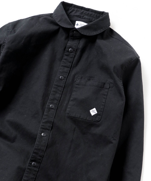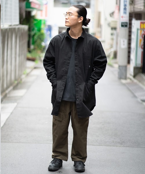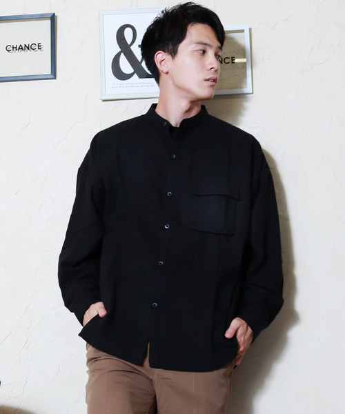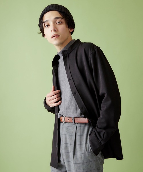 ゆるくカジュアルな着こなしができる黒のバンドカラーシャツです。生地は厚めなのでアウターとしても使えますし、寒い時期はインナーとして使ってもこなれ感のあるコーデを楽しめます。また、伸縮性もあるので着心地も良く、デイリーやタウンユースに使えるおしゃれなアイテムです。