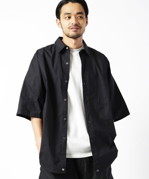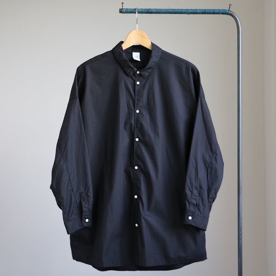 ビッグシルエットのこちらの黒シャツは高い密度で織られたタイプライターシャツで、薄くて軽量なのに張りがあり、ナチュラルな雰囲気を感じさせるシワが特徴です。オーバーサイズなのでゆったりと着ることができ、インナーにいろいろなアイテムを合わせてファッションの幅を広げることができる黒シャツです。