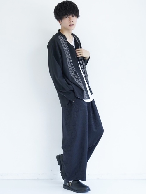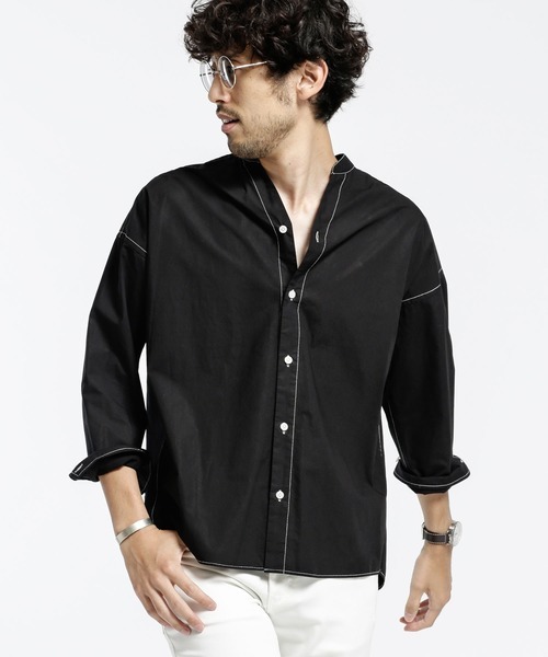 ナノユニバースと京都にあるファッションブランド「京都紋付」がコラボした黒シャツです。バンドカラーのスキッパーシャツは珍しいデザインですが、モダンで華やかな着こなしができるおすすめのアイテムです。ボトムスに黒のパンツを合わせてワントーンコーデにしても、クールでこなれ感のある着こなしができます。