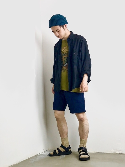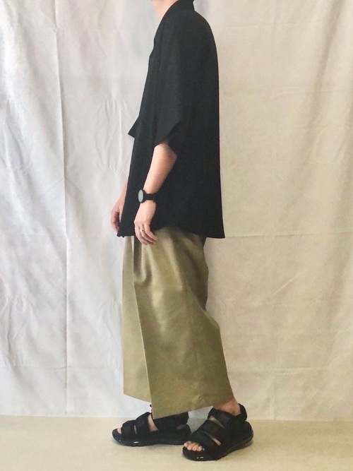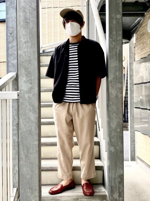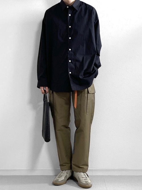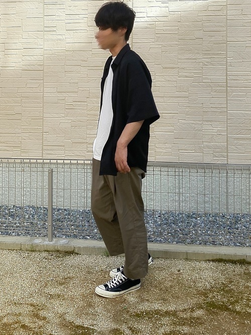 黒シャツの下に白の半袖のカットソーを重ねたカジュアルなレイヤードスタイル。ボトムスにはカーキのパンツを合わせて落ち着いた色合いのコーデに仕上げています。また、パンツはアンクル丈のタックの入ったワイドパンツをチョイスし、コーデ全体にリズム感を出しているのもポイントです。