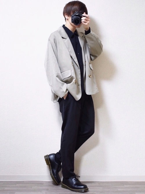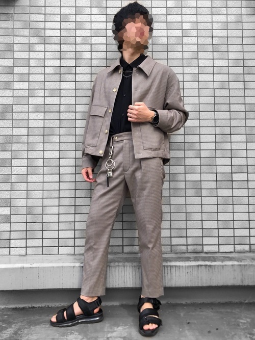 ベージュのセットアップに黒のシャツを合わせたきれいめカジュアルコーデ。いろいろな色と合わせやすいベージュのセットアップですが、黒シャツと合わせることでトレンド感のある男らしいスタイルになります。ブルゾンを脱いでも、黒シャツとベージュのスラックスならかっこよくキマりますね。外しアイテムとして足元にはサンダルを合わせ、程よい抜け感を演出。