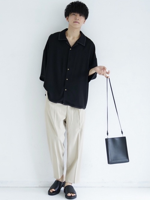 黒のシャツにベージュのパンツを組み合わせて、爽やかな着こなしに仕上げたコーデ。こちらの黒シャツはドレープ感があるので、上品な印象を与えてくれます。パンツはアンクル丈のテーパードデザインのものを選ぶことでバランスも良く見え、すっきりとたスタイルに。足元にサンダルを合わせているので清涼感があり、夏におすすめのスタイルです。
