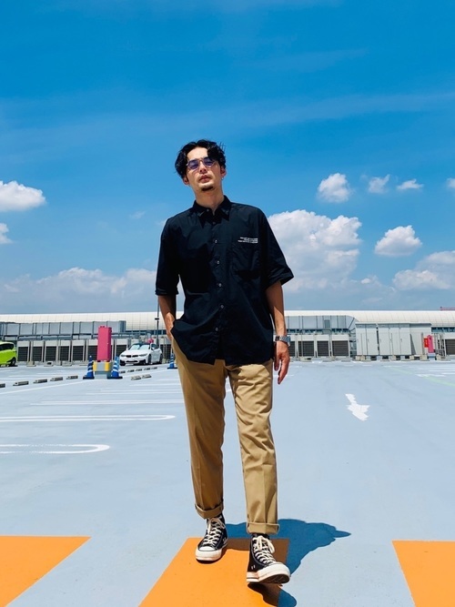 半袖の黒シャツとベージュのチノパンを合わせたカジュアルなコーデです。半袖の黒シャツはバックプリントデザイナなので、プリントを目立たせるためにもほかのアイテムはシンプルなものを合わせるのがおすすめ。ベージュパンツはロールアップしてハイカットのスニーカーをチラ見せすることでこなれ感のある着こなしになります。
