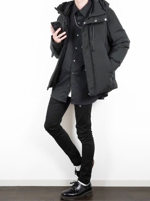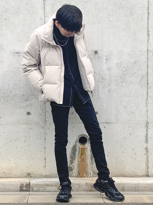 黒のワントーンコーデに白のダウンジャケットを合わせたコーデ。黒シャツは白のステッチが目立つデザインをチョイスし、メリハリのあるワントーンコーデの着こなしになっています。白のダウンジャケットは短めの丈を合わせることでスタイルが良く見えますね。