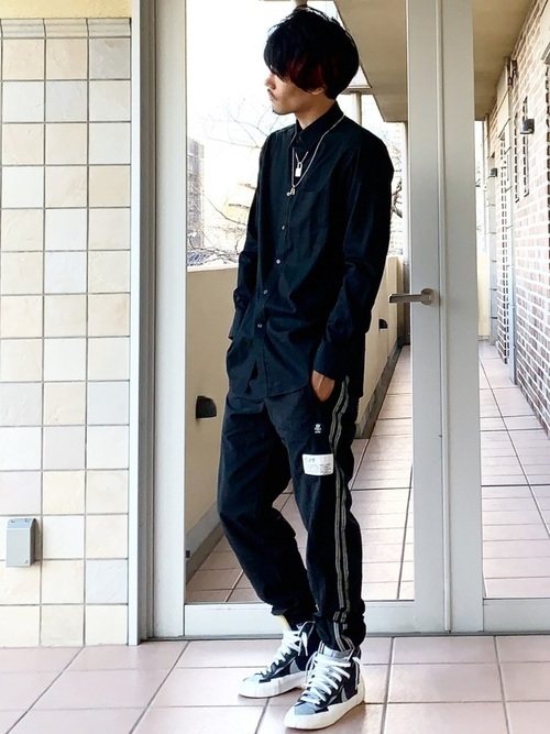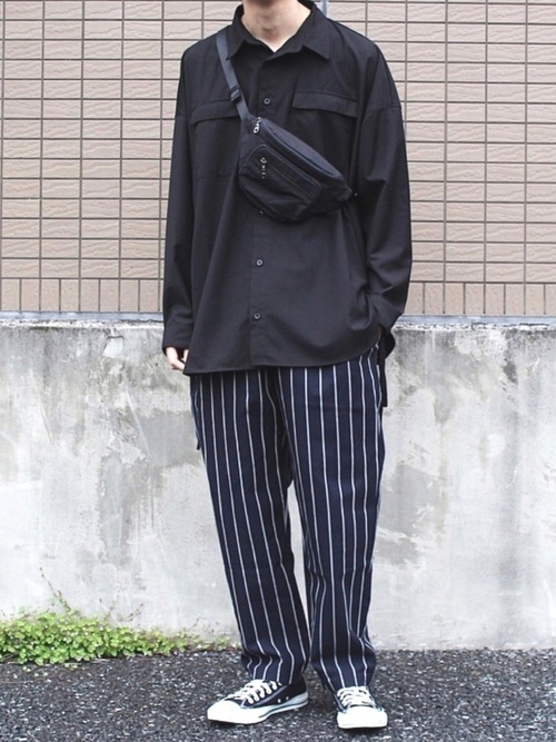 黒シャツは柄物アイテムとの相性も良いので、ストライプのパンツと合わせてもクールにキマります。背中に切り替えの布のついた個性的なデザインのシャツも、黒を選ぶことで合わせやすいアイテムに。足元はスニーカーを合わせてカジュアルダウンさせ、タウンユースにぴったりのメンズコーデになっています。