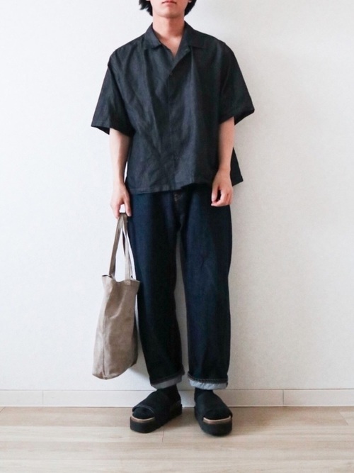 半袖の黒シャツとデニムを組み合わせたコーデ。黒シャツはオープンカラーシャツでぬけ感を出しており、短めの丈なのでワイドのデニムパンツともバランスが良くすっきりとまとまっています。また、足元のサンダルには靴下を合わせてきれいめに仕上げ、丈や合わせるアイテムにこだわりの見えるおしゃれコーデです。