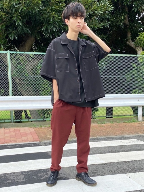ステッチ入り黒シャツは黒単色よりも威圧感がなく、黒シャツを取り入れたカジュアルな着こなしにぴったりのアイテムです。インナーにも黒を合わせてコーデを引き締め、ボトムスにはワインレッドのスラックスで大人カジュアルなメンズコーデに仕上がっています。