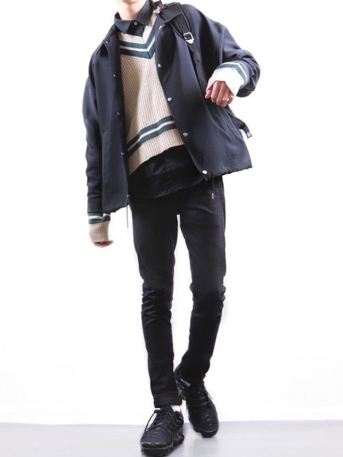 チルデンニットは首元と裾にデザインされた2本線が特徴で、黒シャツを合わせることできれいめカジュアルなコーデに仕上がります。写真のチルデンニットは裾の丈が短くなっているので、スタイルアップ効果があるのも特徴です。アウターにはビックサイズのコーチジャケットを合わせて、メリハリのあるスタイルに。