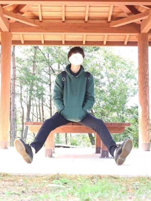 カジュアルなイメージの強いパーカーですが、無地を選べばクールな大人カジュアルな着こなしにすることができます。インナーには黒シャツを重ねてシックな印象にすることで、大人っぽいコーデに。ボトムスも足元も黒でまとめて、かっこいいスタイルに仕上げています。