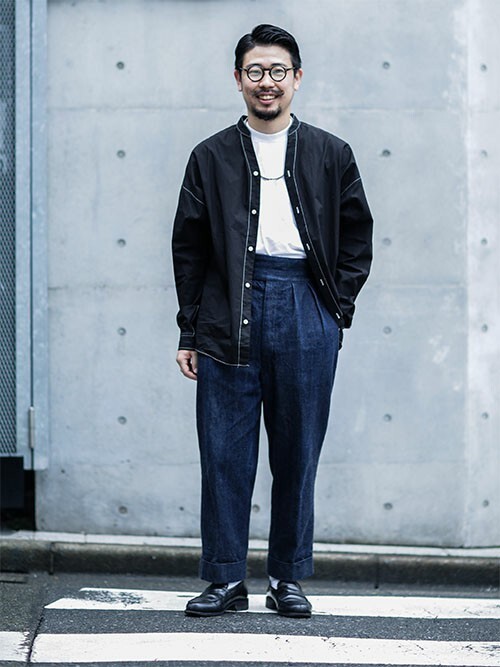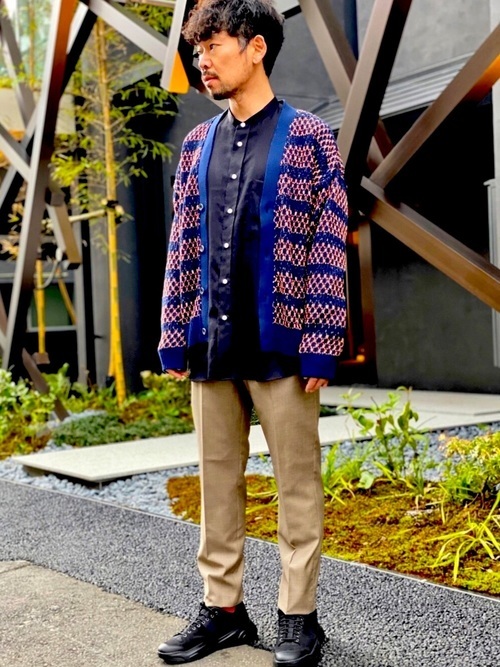 青がベースのタックジャカードカーディガンに黒のスタンドカラーシャツを合わせれば、個性的なきれいめカジュアルな気こなしに。派手な柄物アイテムと合わせても、黒シャツを取り入れれば落ち着いた印象のスタイルにすることができます。コーデの外しアイテムとして足元には黒のスニーカーを合わせた、おしゃれ上級者のメンズコーデです。