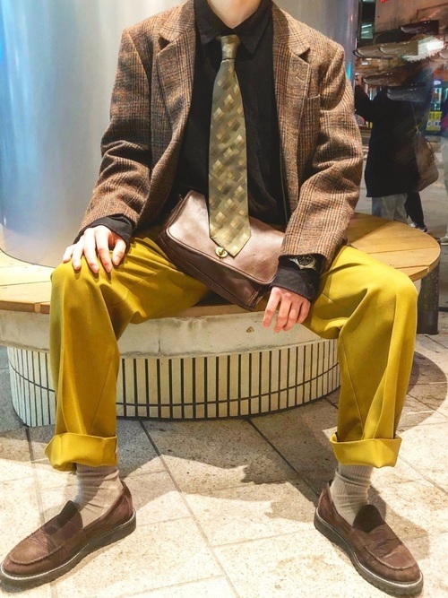 ウールジャケットに黒シャツを合わせて、きりっとした印象の大人のきれいめコーデです。ボトムスには黄色のインパクトのあるスラックスを合わせて、コーデのアクセントに。ウールジャケットと足元を同じ色で合わせることで統一感が生まれ、まとまりのある仕上がりになっています。