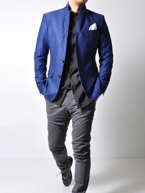 青のテーラードジャケットに黒シャツを合わせたセミフォーマルなコーデ。インナーに黒シャツ、ボトムスにシックな色合いのパンツを合わせてテーラードジャケットの青色が映えるおしゃれな着こなしです。足元は黒のローファーを合わせてコーデを引き締め、大人の男性が真似したいコーデに仕上げています。