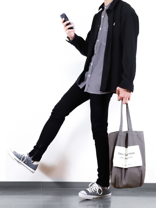 黒シャツを取り入れた黒のワントーンコーデ。黒でまとめるとクールな印象の着こなしになりますね。黒のワントーンコーデはかっこいいですが、すべて同じ色なのでメリハリのない退屈なコーデになりがちです。