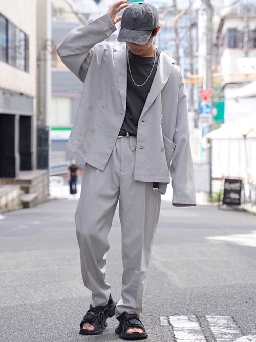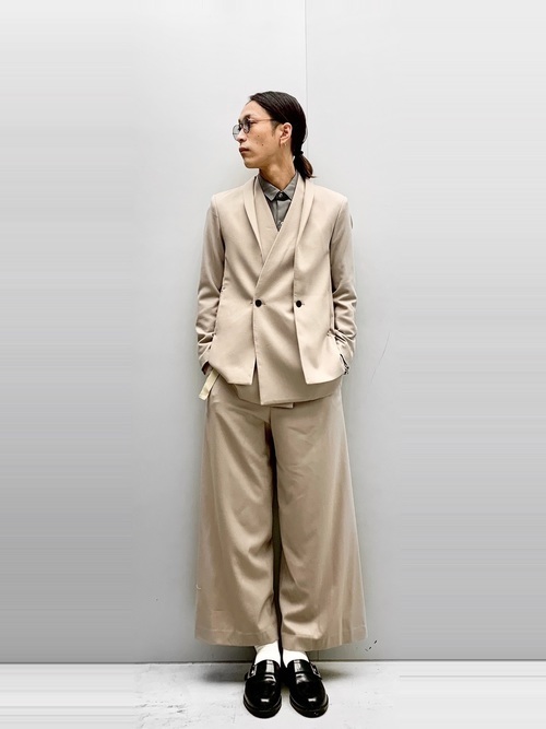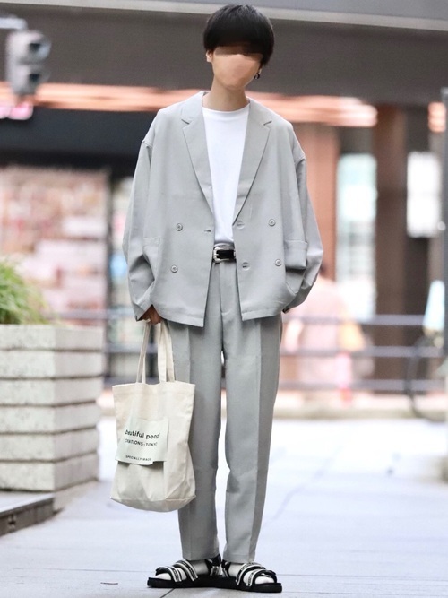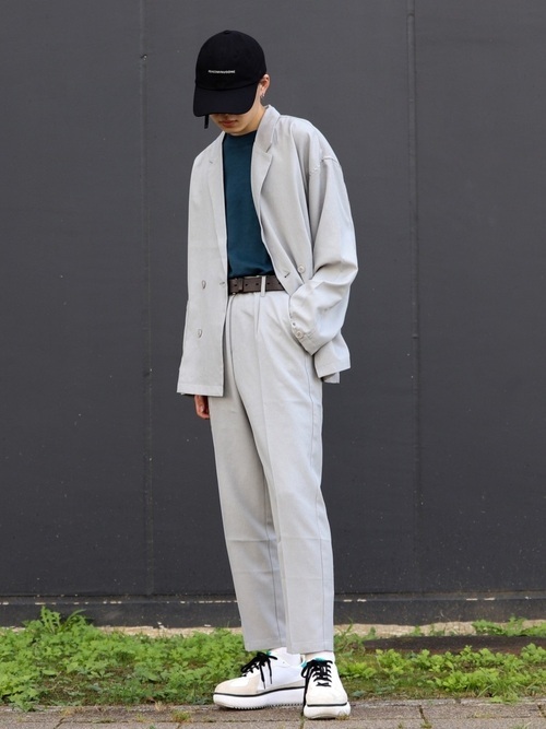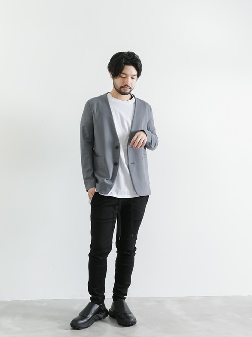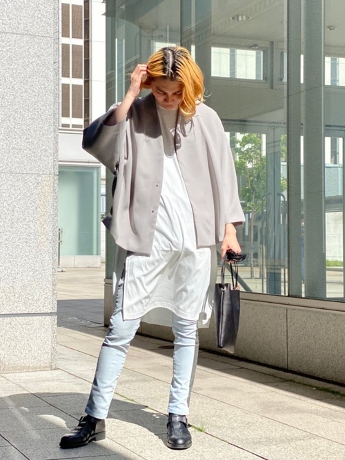ライトカラーで清涼感のあるモードスタイル。作務衣のようなデザインのノーカラージャケットがモダンで品のある印象です。ユニークなデザインの白のビッグカットソーが、コーデにクリーンさと個性をもたらしています。黒のハンドバッグとグルカシューズでさらに洗練された着こなしに仕上がっています。