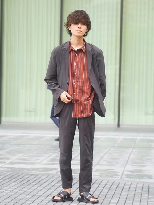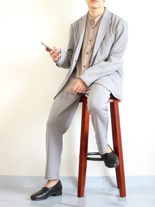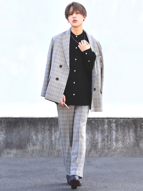 グレーチェックセットアップ×黒バンドカラーシャツ