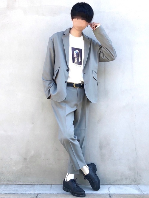 グリーンがかったニュアンスのあるスモークグレーのセットアップと白のアートプリントTシャツのきれいめカジュアルコーデ。アンクル丈のパンツからのぞくソックスのラインもポイントに。