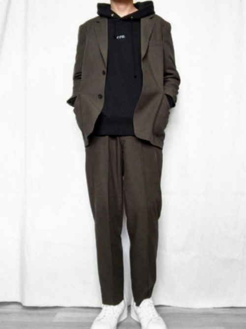ブラウンがかったダークグレーのセットアップを黒のスウェットパーカーと白のスニーカーでカジュアルダウンしたコーデ。リラックスシルエットのセットアップにパーカーのカジュアル感がプラスされることで、こなれ感のある着こなしになっています。ダークカラーの中でスニーカーの白も映えています。
