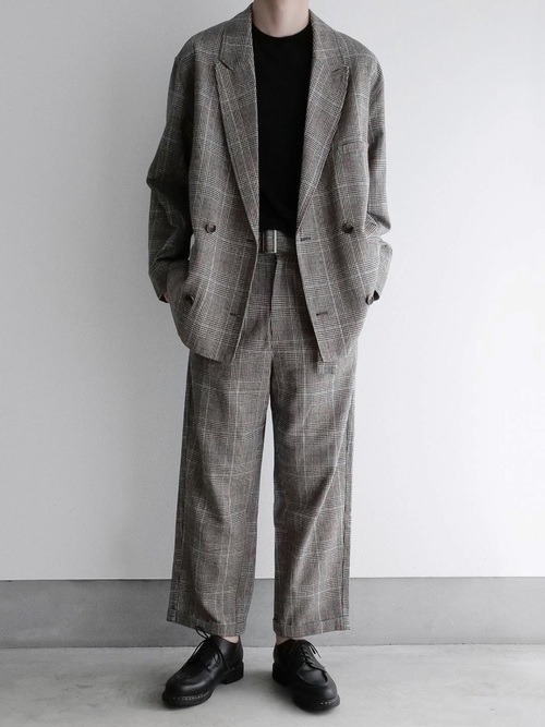 ビッグシルエットのチェックジャケットとスリムなスラックスに旬のバンドカラーシャツを合わせたコーデ。ライトグレーと黒のコントラストが目を引く、メリハリのある着こなしです。