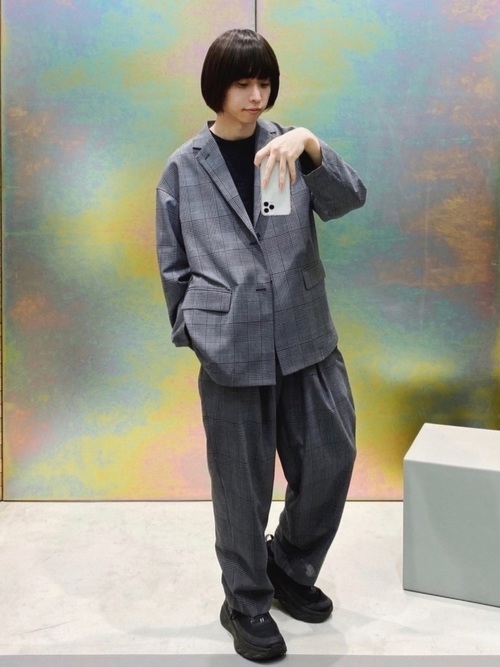 ゆとりのあるリラックスシルエットのセットアップコーデ。グレーチェックにブラックのインナーでシックな印象に。ボリュームのあるスニーカーのハズしにこなれ感が出ています。