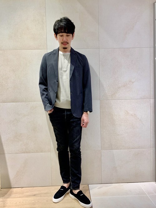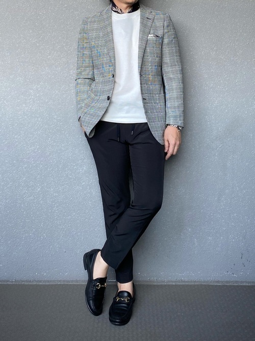 ジャストサイズのテーラードジャケットと細身の黒パンツを合わせたIラインシルエットのコーデ。インナーの白がさわやかな大人のきれいめカジュアルです。ローファーテイストのスニーカーもコーデのテイストに合っていて、スマートな着こなしになっています。