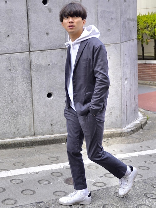 きちんと感のあるダークグレーのセットアップを白のパーカーとスニーカーで着崩したコーデ。白の清潔感が引き立ち、さわやかで親しみやすい印象の着こなしに仕上がっています。