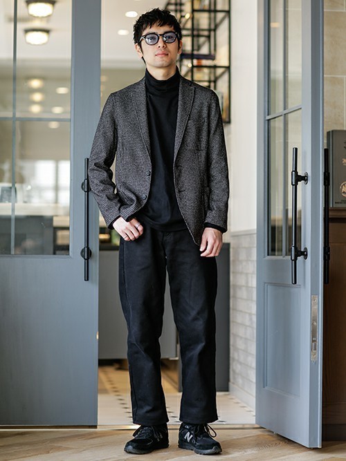 ブラックのインナーは、グレーテーラードジャケットのコーデにシャープな男っぽさや大人らしさ、スマートな印象を与えてくれます。Tシャツはもちろん、タートルネックもクールな大人らしさが出るのでおすすめです。