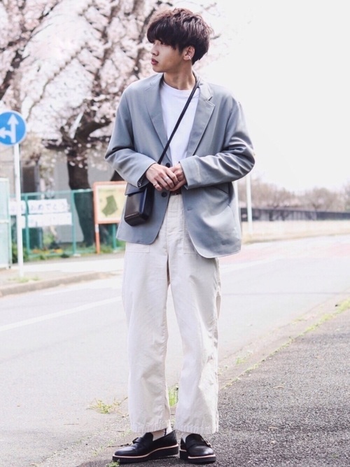 ブルーがかったスモーキーグレーのテーラードジャケットに白のインナーとボトムスを合わせたさわやかな着こなし。相性抜群のグレー×ホワイトで清潔感があり、春にぴったりのコーデですね。バッグとシューズが淡いカラーのコーデを引き締めています。