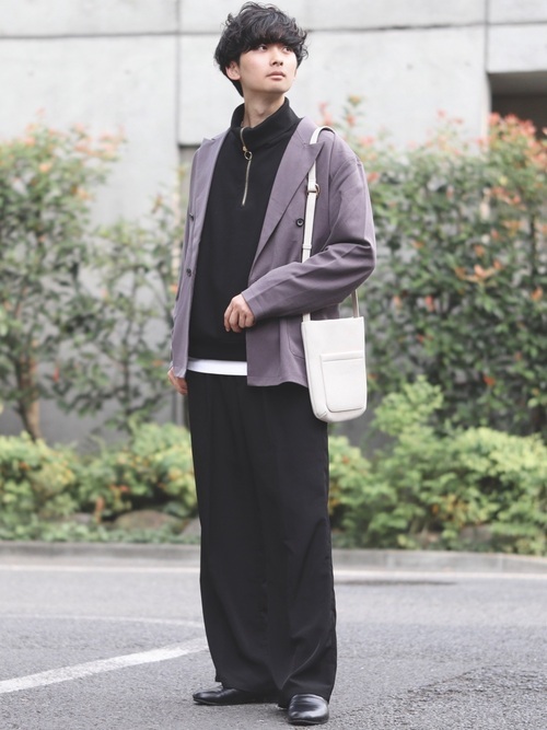 ブラウンがかったグレーのジャケットに黒のワイドパンツとタートルネックスウェットを合わせたコーデ。カジュアルアイテムのスウェットとワイドパンツも黒ならシックに。タートルのリングジップがアクセントになっています。インナーの白Tシャツとショルダーバッグが抜け感をプラス。