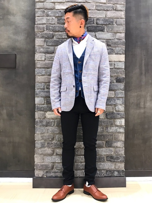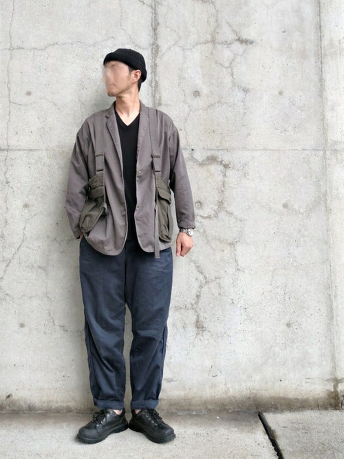グレージャケット×カーキベスト×ネイビーパンツ×黒Tシャツ