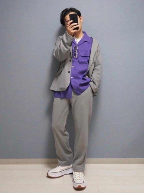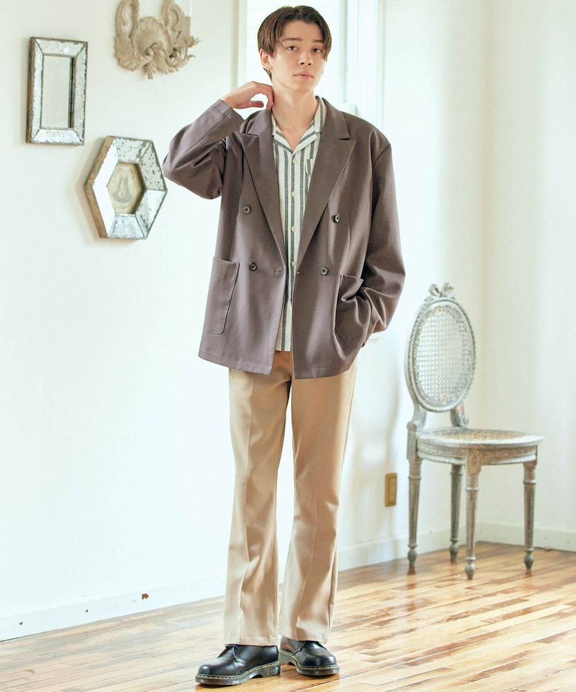 グレージャケット×ベージュワイドパンツ×グレーシャツ