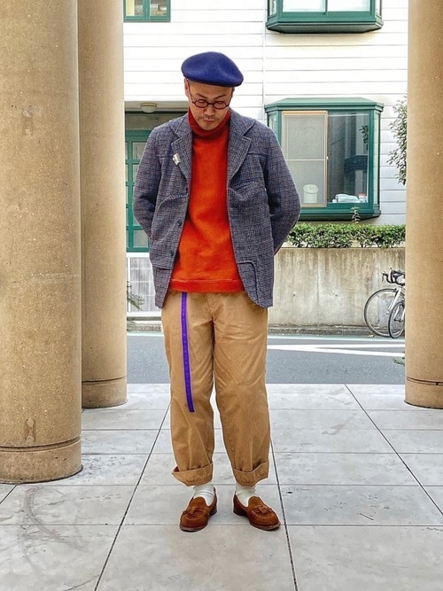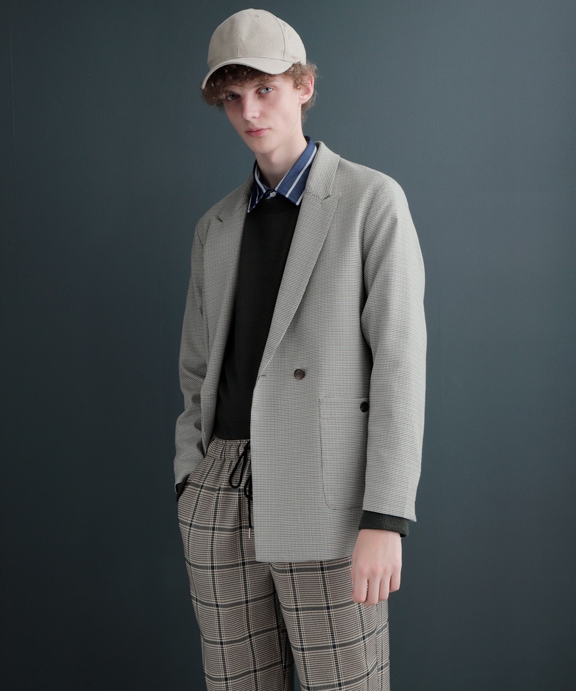 特徴的なデザインのチェックのグレーテーラードジャケットとベージュパンツ、ブラウンのスウェットのコーデ。スウェット、パンツ、シューズをブラウン系で統一しているので、コーデに安定感とおしゃれ感があります。ウェスト部分のパープルとハンチング帽がアクセントに。