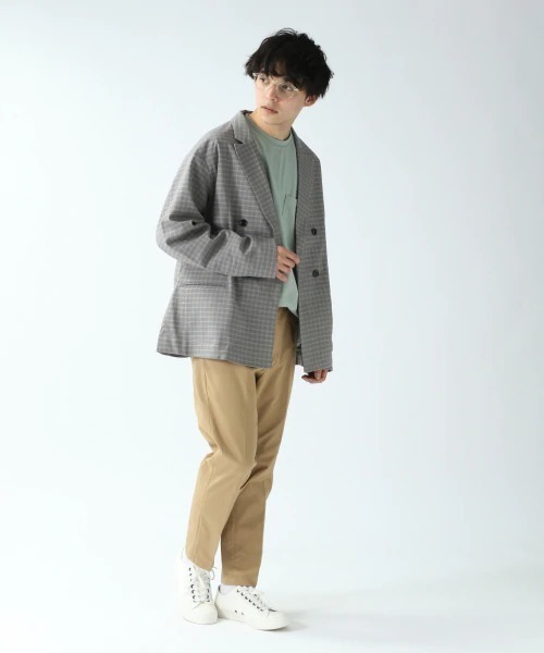 チェックジャケット×ベージュパンツ×ブラウンスウェット