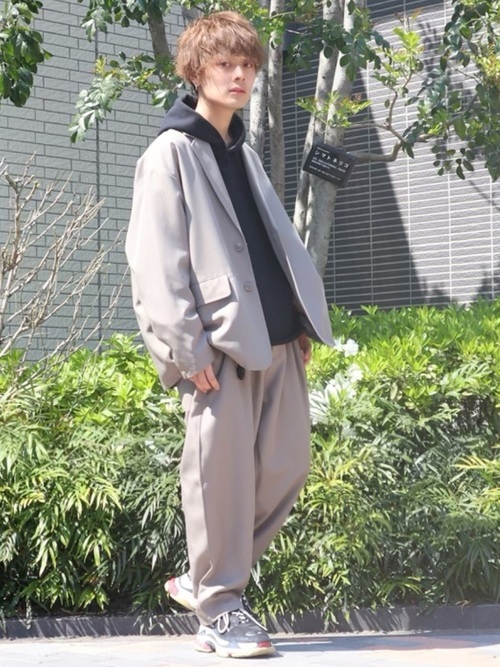 グレーテーラードジャケットは、きれいめアイテムです。そのため、合わせる他のアイテムもきれいめだと堅くるしい印象になりがちです。そこで、カジュアルときれいめのバランス問題を一気に解決してくれるのがパーカーです。旬のセットアップスタイルもパーカーを合わせることでフレンドリーな雰囲気になります。