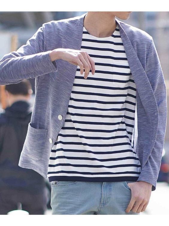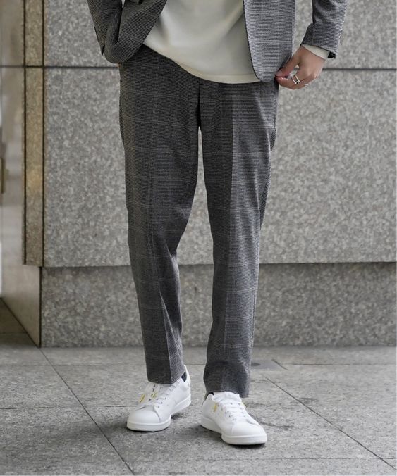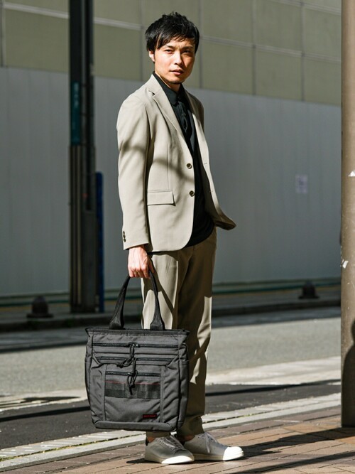 メランジのジャケットは、軽やかな中にも上品さを演出できるおすすめアイテムです。こちらのコーデはセットアップできちんと感を出しつつも、中にはブラックのポロシャツ、足元はスニーカーにするなど遊びを持たせており「ハズし」が効いています。