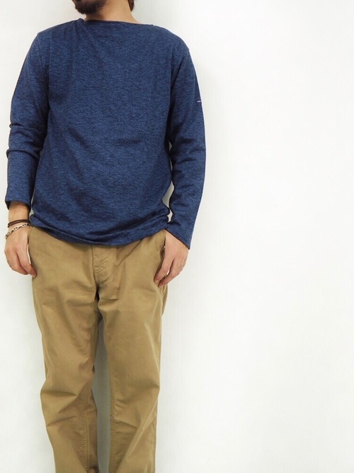 霜降りブルーというメランジ特有のカラーで着こなしができるこちらのロングTシャツ。チノパン合わせでカジュアルにキメるのがおすすめです。この1枚だけでもしっかりとスタイルが完成するので、メランジは取り入れ方次第でかなり便利に着られることがわかります。