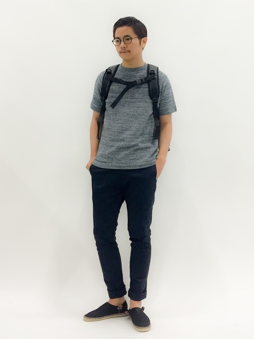 ニットのイメージが強いメランジですが、Tシャツでも楽しめます。サラッと着れるため暑い日でも問題ナシ!リュックと合わせたカジュアルコーデがおすすめです。ボトムスをハーフパンツに変えるとまた違った印象にできますよ。スリッポンだと、靴下でなくても履きやすく◎