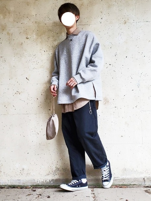 こちらはなんとレディースのアイテムをうまくコーデに取り入れている例です。レディースでもオーバーサイズの服が増えてきているため、このように自然に組み合わせられれば違和感もありません。見える面が多いプルオーバーでも、メランジを選ぶと変化が楽しめますよ。