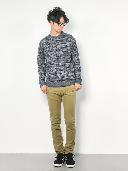 オシャレなメランジのクルーネックニットにLeeのスキニーパンツを合わせています。カラーパンツにすることで、コーデのメリハリがつき、さらにメランジの良さも浮き立ちますよ。小物である眼鏡とスニーカーを黒にしているので、全体が締まって見えるのもポイントです。