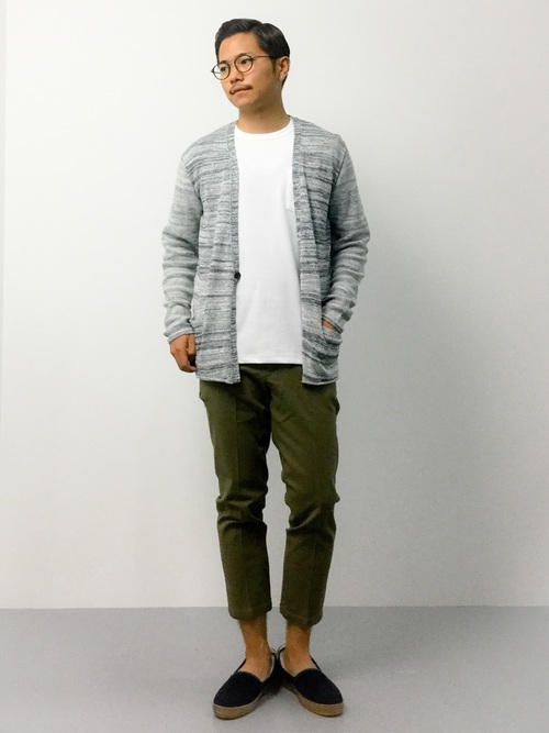 カーディガンにカーキのパンツを合わせた、こっくり色の秋コーデです。足元はあえて靴下を見せず軽めに、中に合わせるTシャツも白を持ってくることで重くなりすぎずまとめやすくなります。単色グレーよりも、メランジのグレーを選ぶことで、トップスとのバランスも取りやすいですよ。
