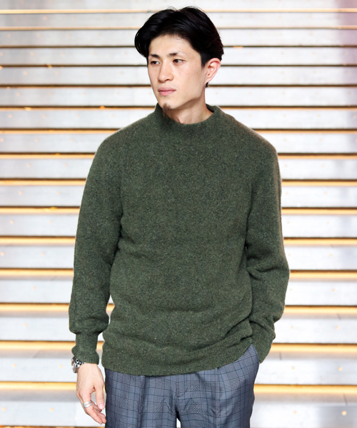 こちらは同色系メランジのセーターです。ダークグリーンの中にもよく見るとイエロー系やホワイト系の毛が混ざっていて優しい風合いに仕上がっています。さらに最近注目度が上がっているモックネックで、誠実な印象も与えられますよ。