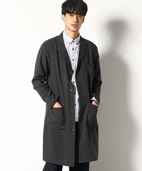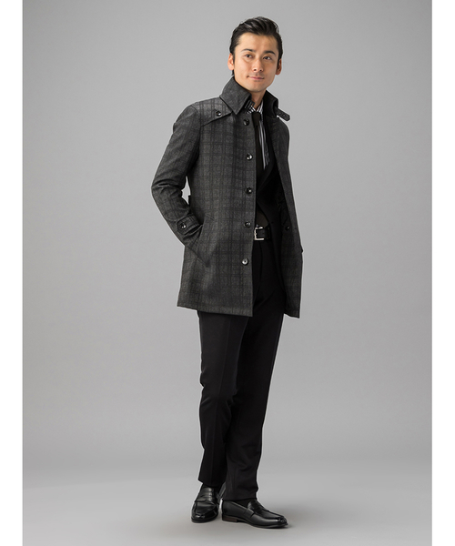 スーツとの相性抜群なこちらのコートにも、メランジが使われています。PSFAのこのコートの特徴は、スーパースリムシルエットでありながら、さらに撥水加工やアクションプリーツなどアクティブな日常にも対応しうる加工がなされていることです。メランジのチェックは目立ちすぎず、でも無地よりおしゃれでどの年代の人でも着用しやすいですよ。